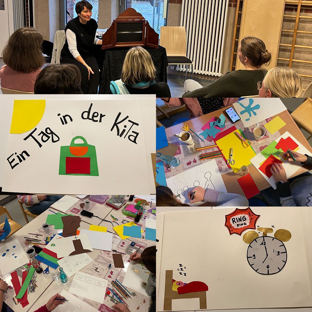 Die entstandenen Kamishibais werden zum Abschluß dem Team vorgeführt.